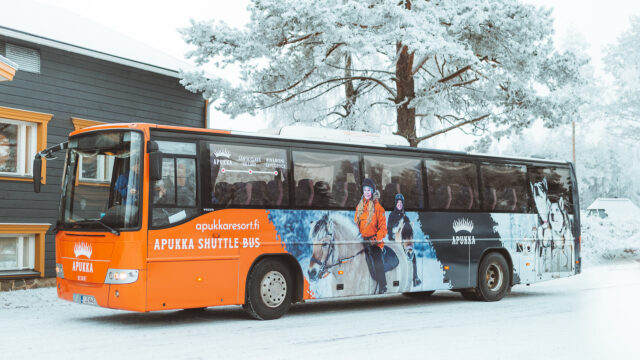 Apukka Shuttle Bus operates several times daily between Apukka Resort, Santa Claus Village, and Rovaniemi city center. Everyone can use the Shuttle Bus for any journey between these three locations.