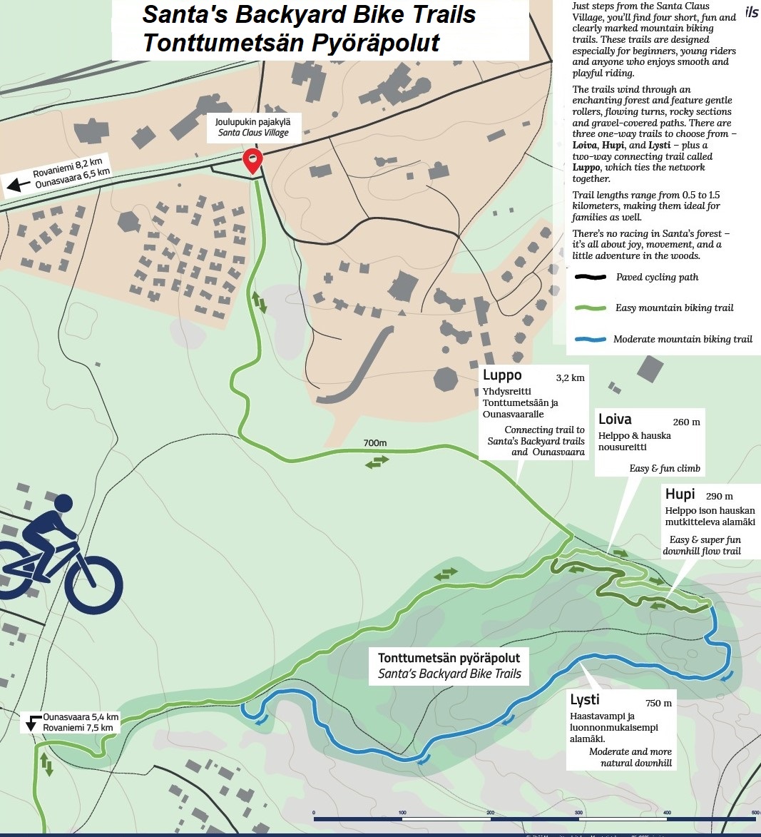 The starting point of the new bike park is located next to the official bus stop of Santa Claus Village, at the intersection of Joulumaantie and Tähtikuja streets, near Santa Claus Holiday Village. The distance from the starting point to the four aforementioned trails is about 800 metres. Travellers can rent bicycles at the reception of Santa Claus Holiday Village or from its online store. Information about bike rental.
