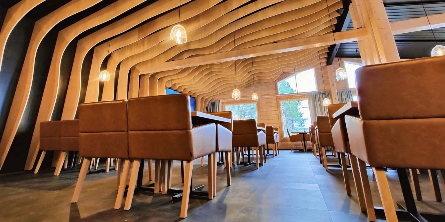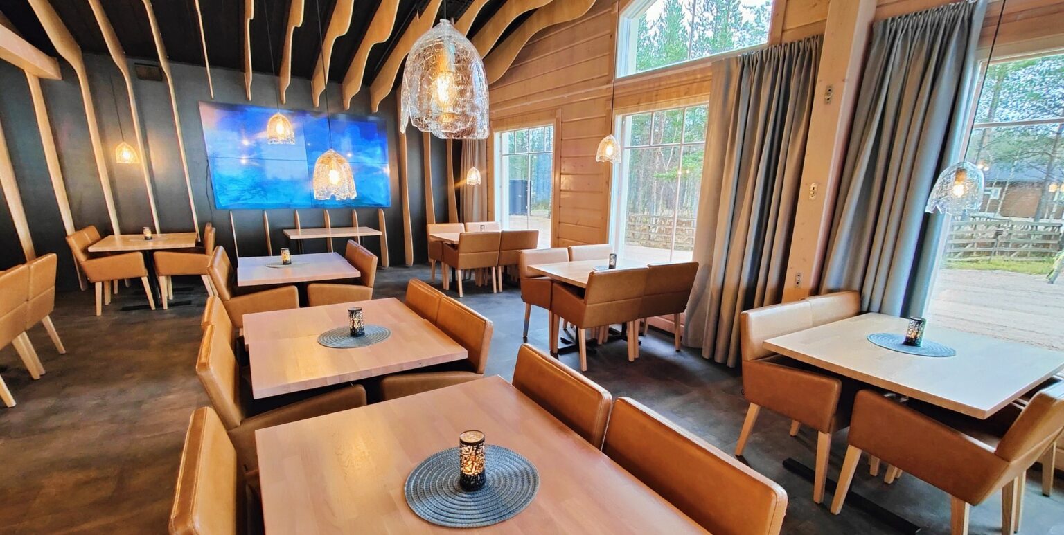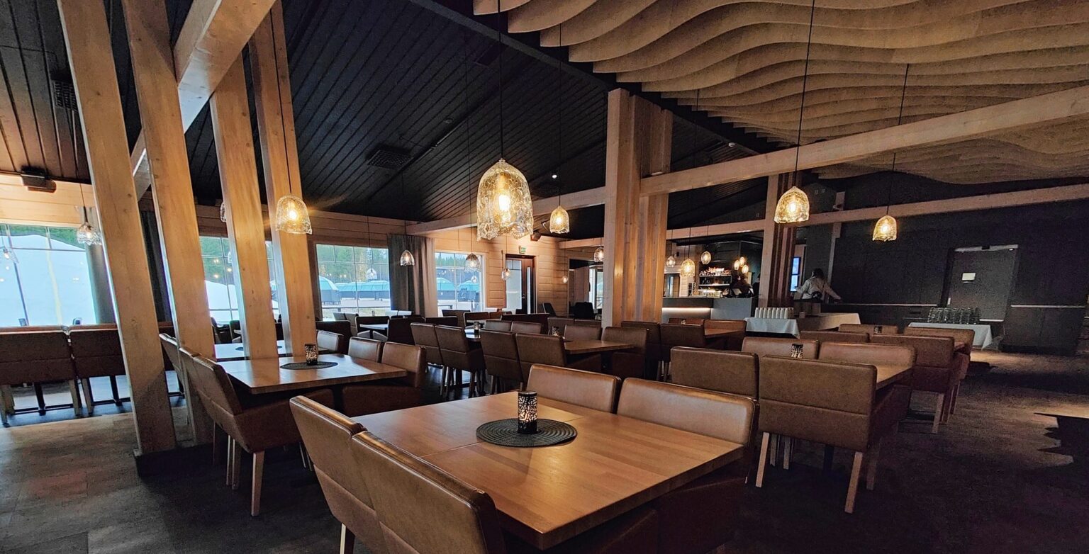 Log Restaurant Lumikartano whit floor space of 500 m² taking up to 150 charter guests is ideal to serve lunches and dinners for big groups. Being rich in atmosphere, the restaurant space is an ideal venue for different events.