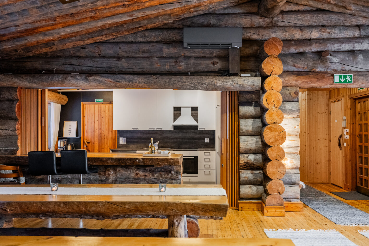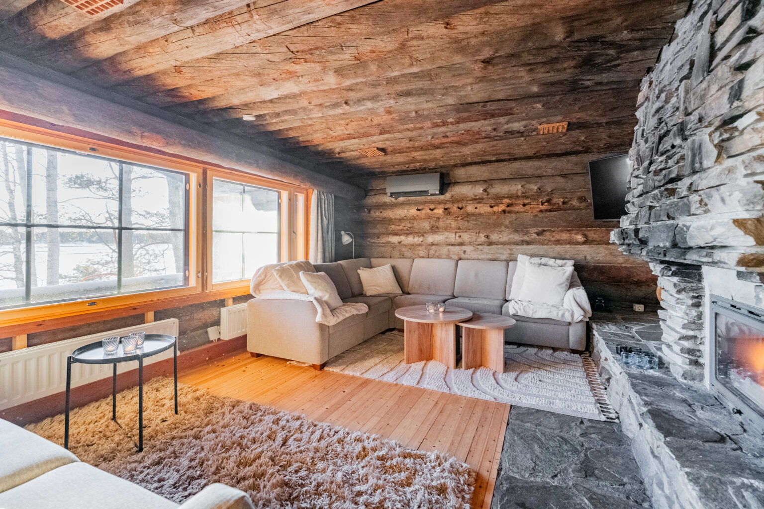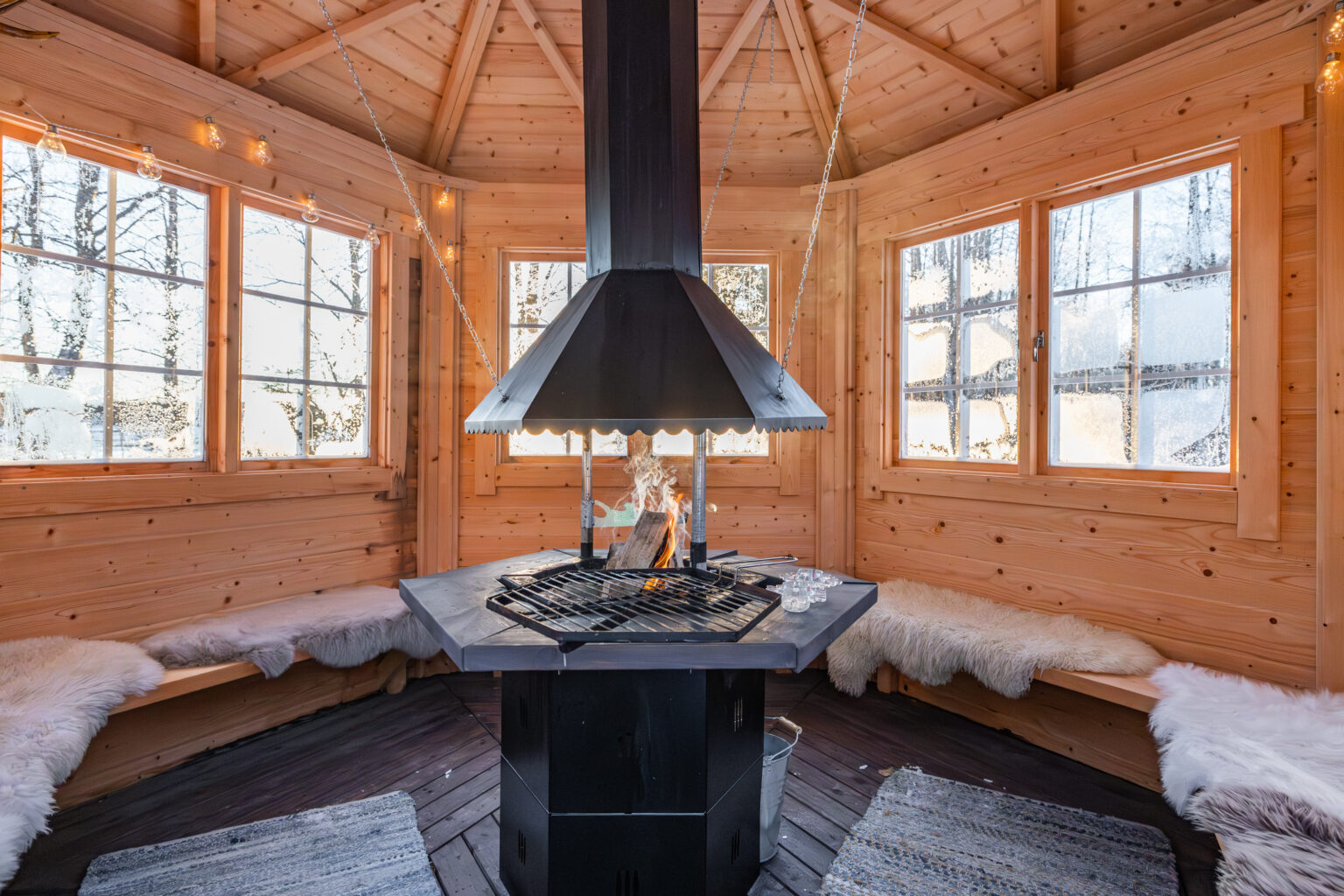 Outside, you can relax on the large terrace, soak in the warm outdoor hot tub, or enjoy a campfire under the open sky. A cozy grill hut is also available for your use. And for a truly Finnish experience, a traditional warm water tub can be booked for an additional fee – ideal for memorable evenings under the northern skies.
