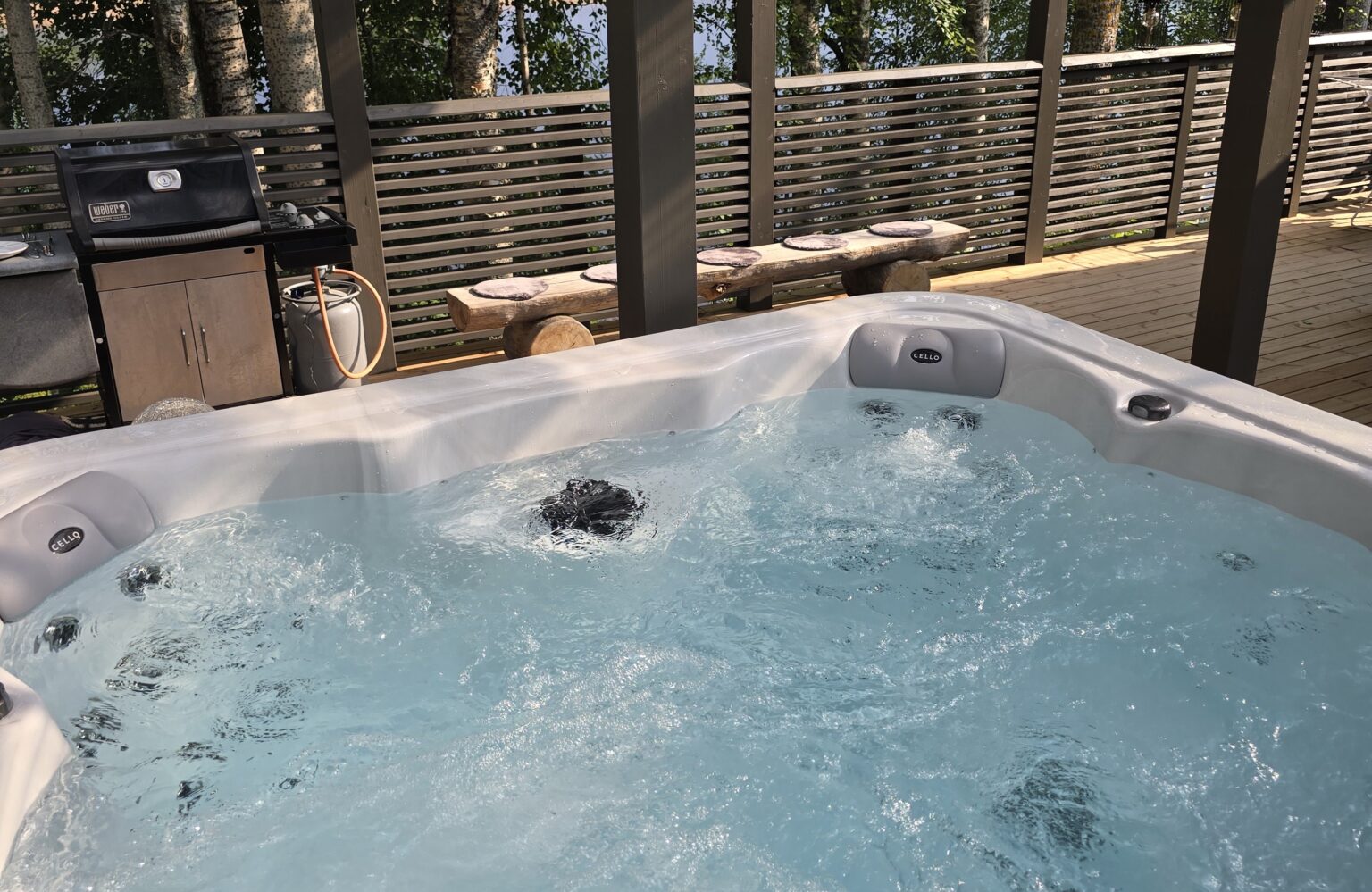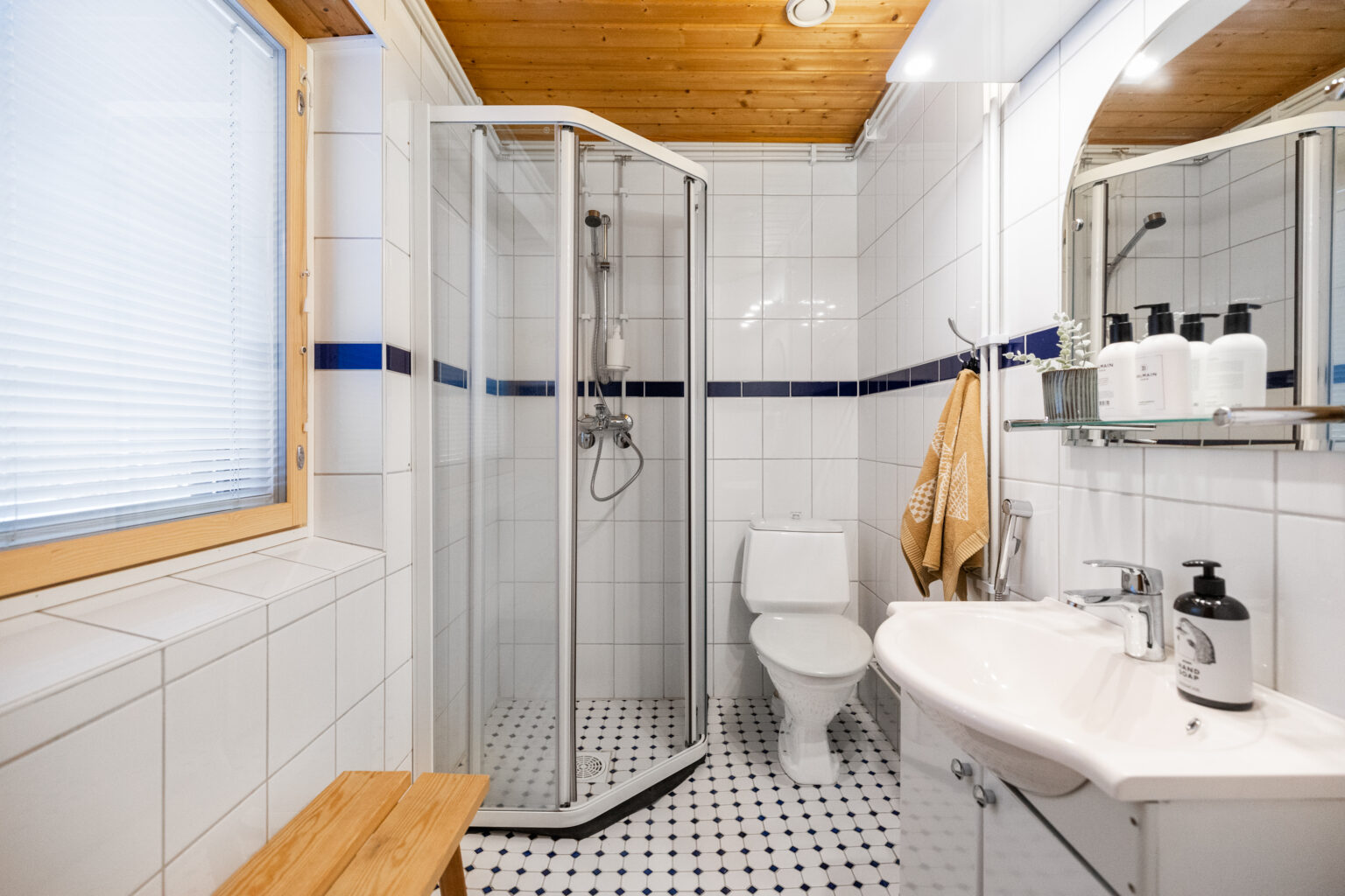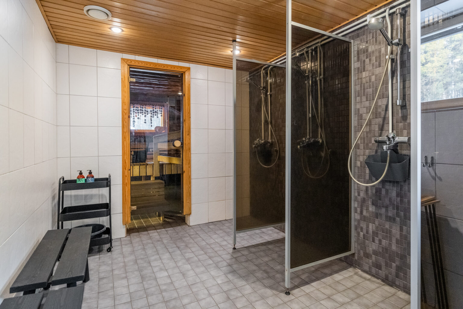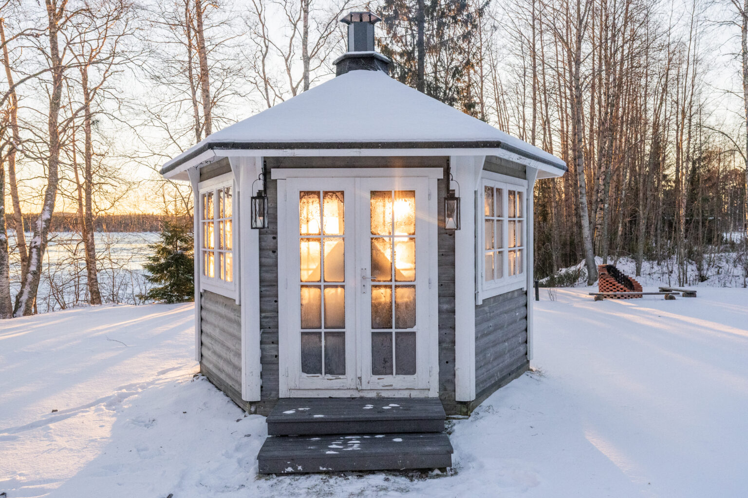 Outside, you can relax on the large terrace, soak in the warm outdoor hot tub, or enjoy a campfire under the open sky. A cozy grill hut is also available for your use. And for a truly Finnish experience, a traditional warm water tub can be booked for an additional fee – ideal for memorable evenings under the northern skies.