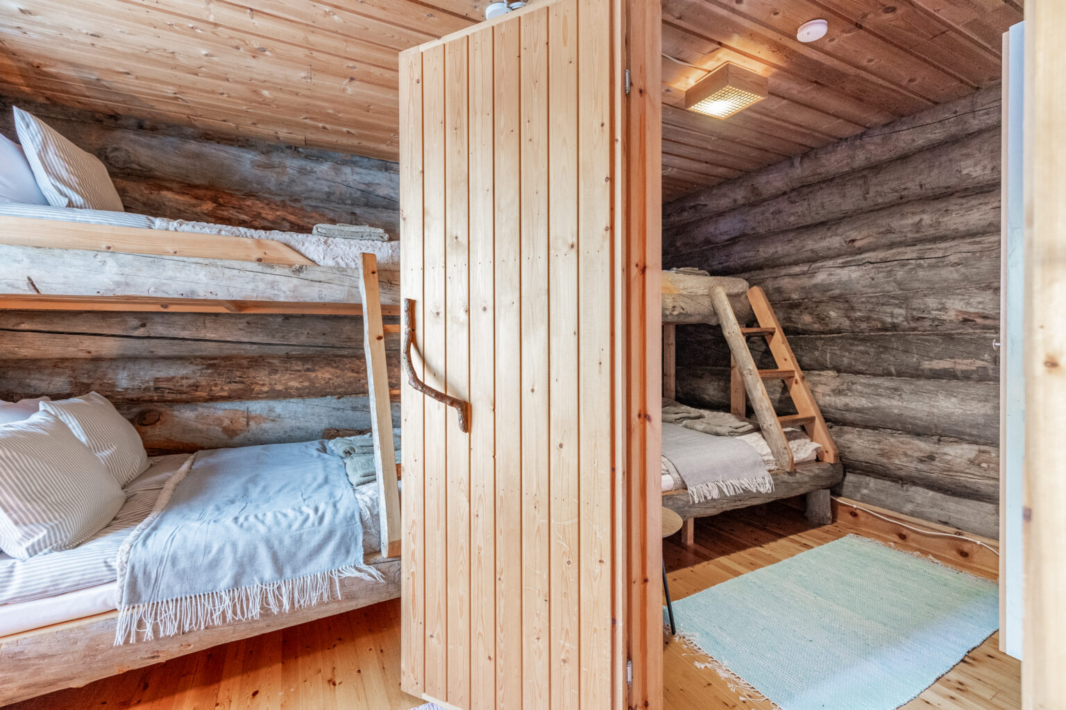 The accommodation sleeps up to 14 guests. The main cabin features four bedrooms (each with a double bed and a loft bed), a spacious living and dining area, and two bathrooms with showers. In the separate sauna cottage, you’ll find a traditional wood-fired sauna, three showers, a small kitchen, and a sofa bed for two.