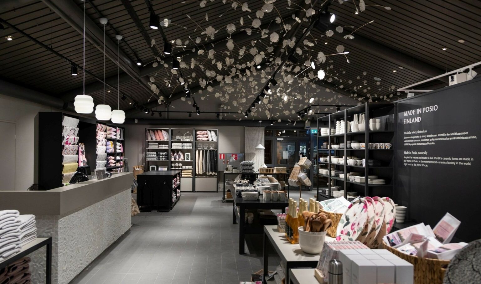 In the Pentik Arctic Circle store you will find ceramic tableware collections and applied art pieces for homes, all made in Posio, Finland. Seasonally changing textile collections and interior decoration items provide inspiration throughout the year. A further reason to visit the store is the Riding the Wind installation by Pentik’s founder, ceramic artist Anu Pentik. The installation consists of hundreds of ceramic seeds covering the roof of the store.